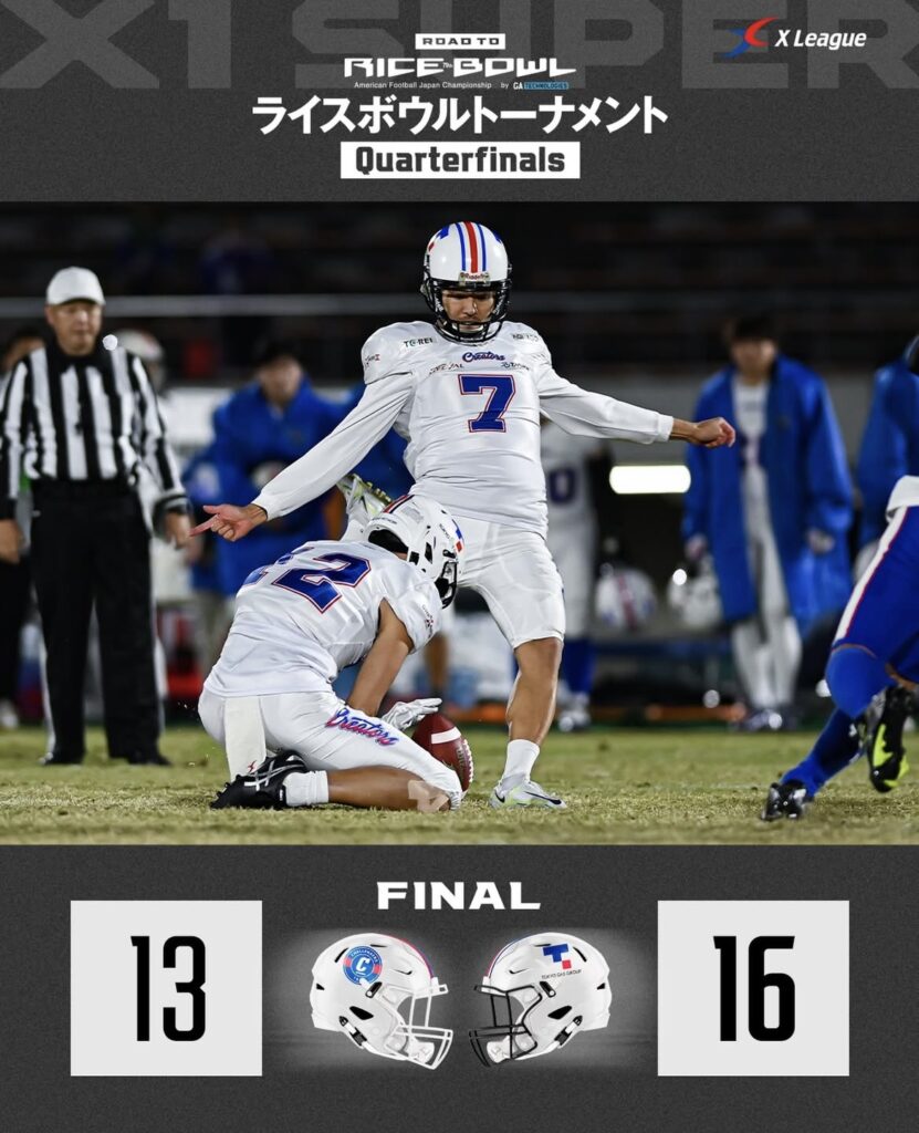 11/23(日)に行われましたライスボウルトーナメント初戦となるQuarterFinal SEKISUIチャレンジャーズ戦は、TBの激闘の末16-13で勝利いたしました。