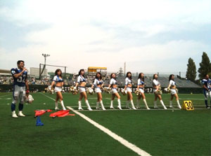 青空の中、川崎球場では、クリエイターズの選手の青いユニフォームが爽やかに走り抜けて、