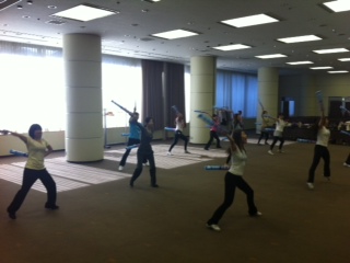 着替えて皆で集合し、容子コーチのリードでまずは皆でストレッチ~。