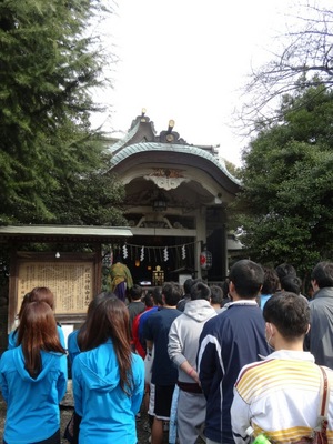 まず、朝いちばんに、選手、スタッフ、チアの全員が集合し、猿江神社に必勝祈願に行ってきました。