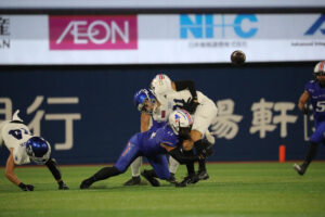 続く相手オフェンスシリーズも、LB#11松倉主将選手の渾身のタックルから生まれたファンブルボールをDL#9吉田選手がリカバー。