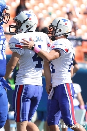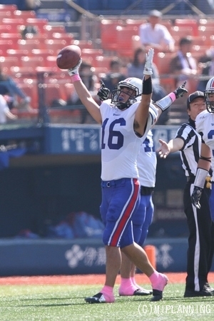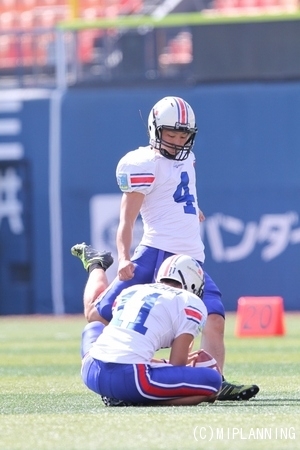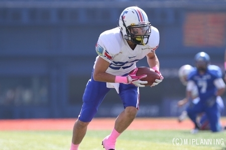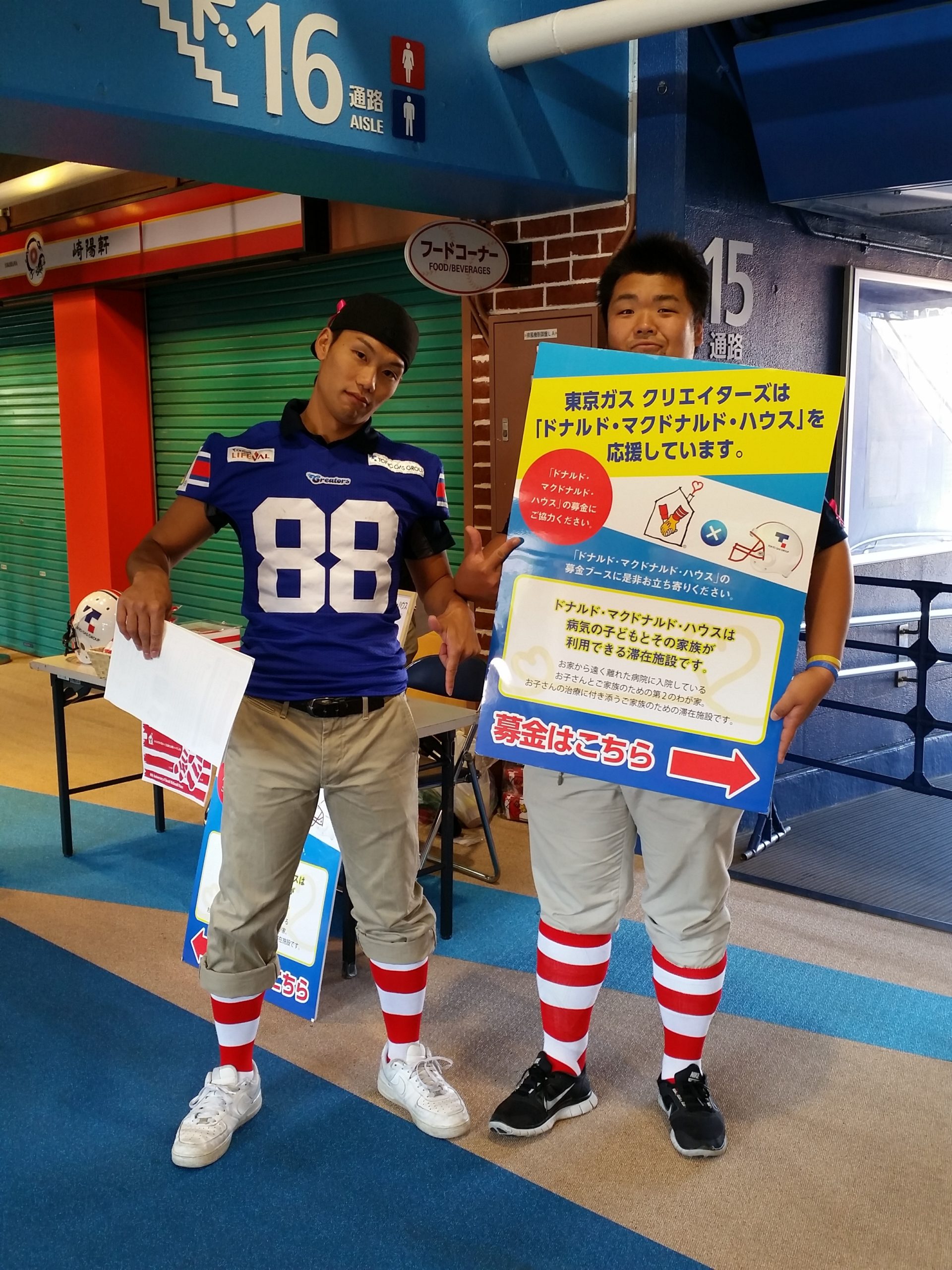 #88WR岩越選手と#77OL鈴木選手は赤白のスマイルソックスを履いてチャリティー活動のお手伝いをさせていただきました。