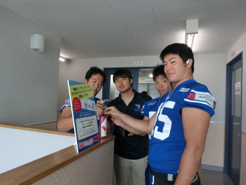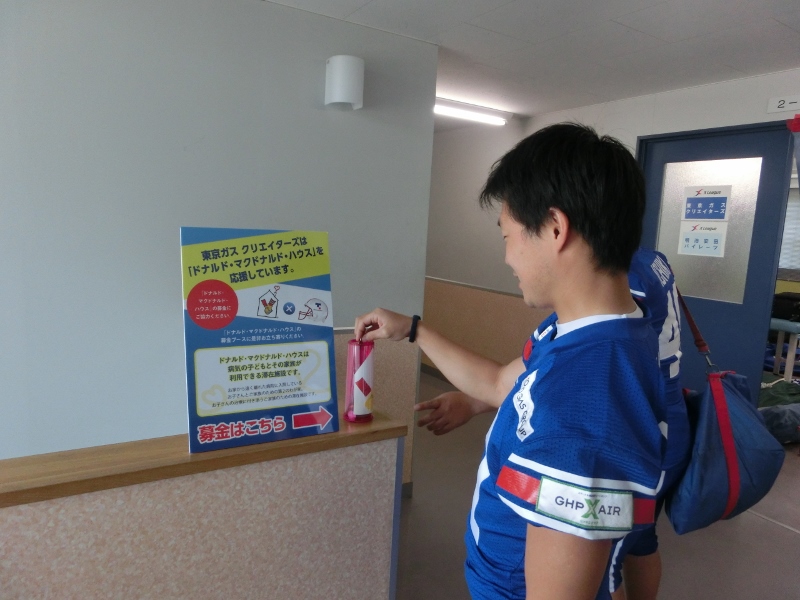 選手達はアップなどがあり、特設ブースで募金することができなかったため、試合前にロッカールームにて募金をしました。