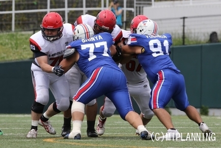 1stダウンを1回更新されるが、6プレイ目でクリエイターズ#12LB安田がパスをインターセプトし攻守交代。