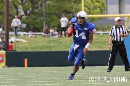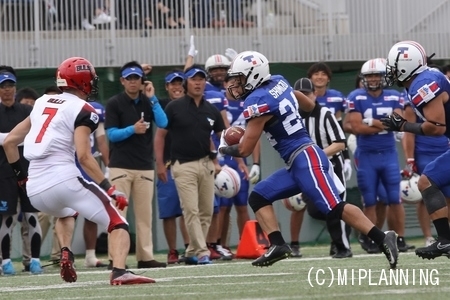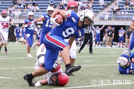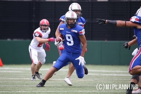 1プレイ目で#22RB尾花の9ydランでタッチダウン。【24-7】