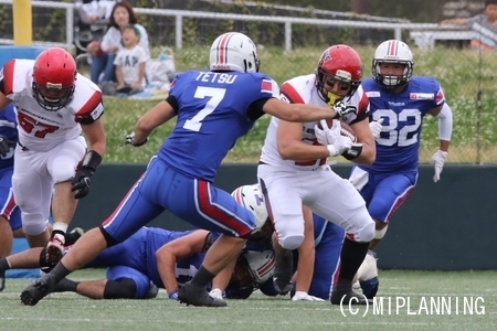 第4Q、レッドゾーンに入ったところでクリエイターズ#2LB池田がQBサックを決め9ydロスさせるが、次のプレイでブルズ#6から#1への29ydパスが通りタッチダウン。【38-14】