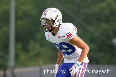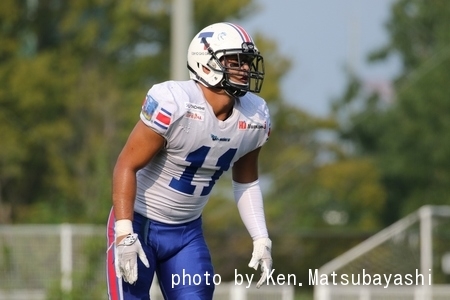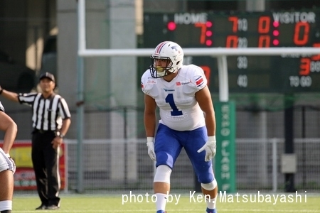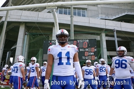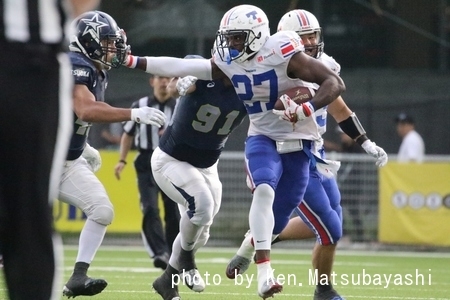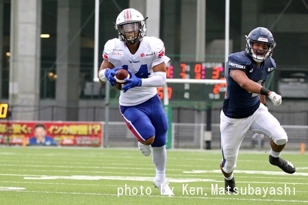 エレコム6回目の攻撃は一度ダウンを更新され、RB#44に60ydのタッチダウンランを決められてしまい【3-14】となる。
