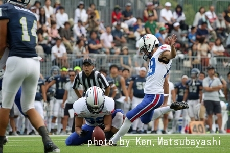 クリエイターズの5回目の攻撃は#27RB アンドレのランと#6QBイカイカのパスで ダウン更新を狙うも決まらず、4th ダウンは#19Kの関根のフィールドゴールで得点を狙う。キックは無事決まり【3-7】となる。