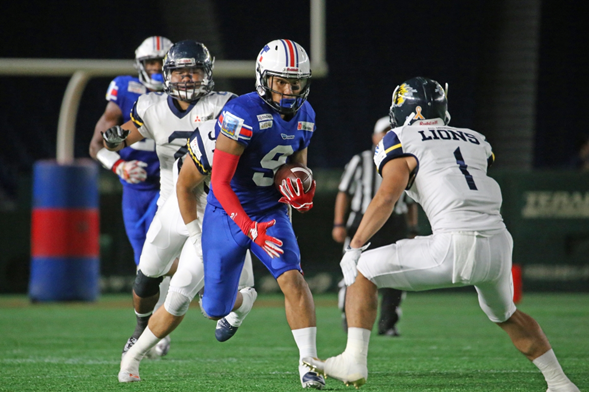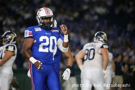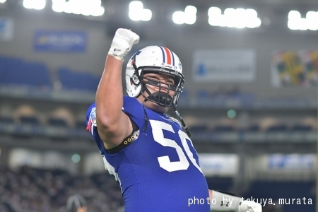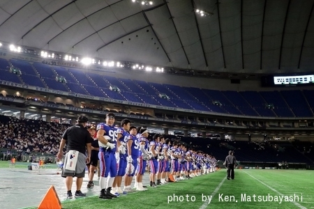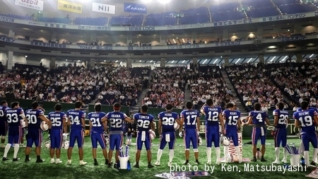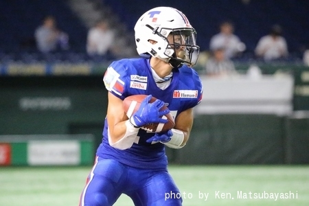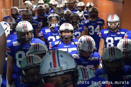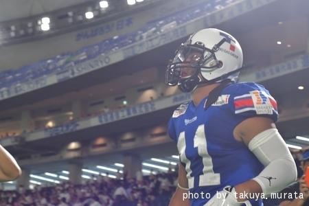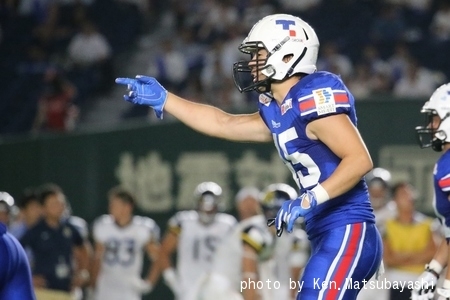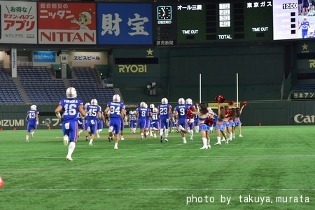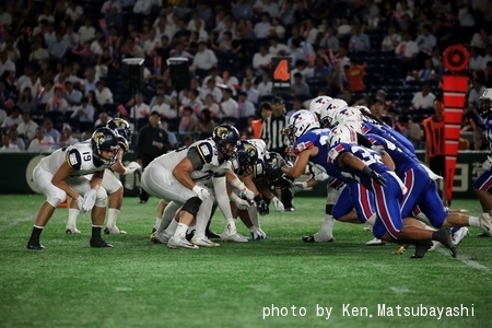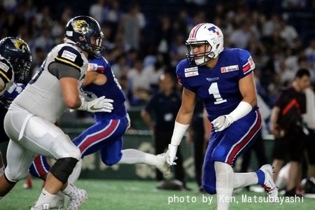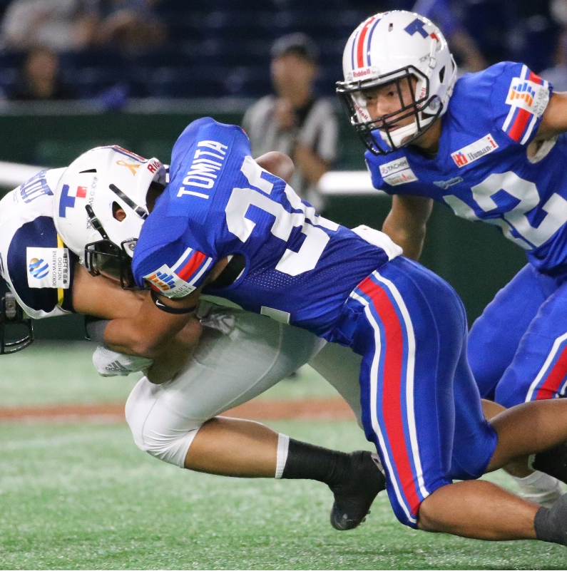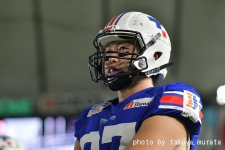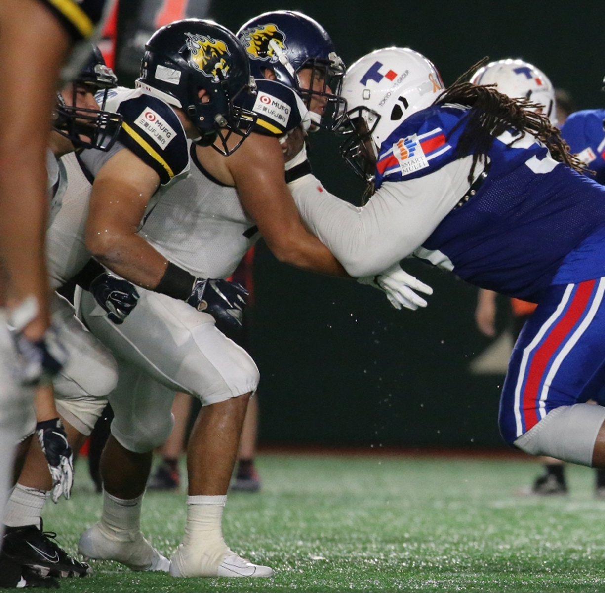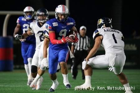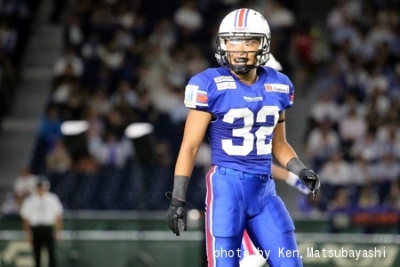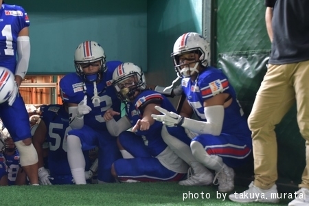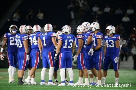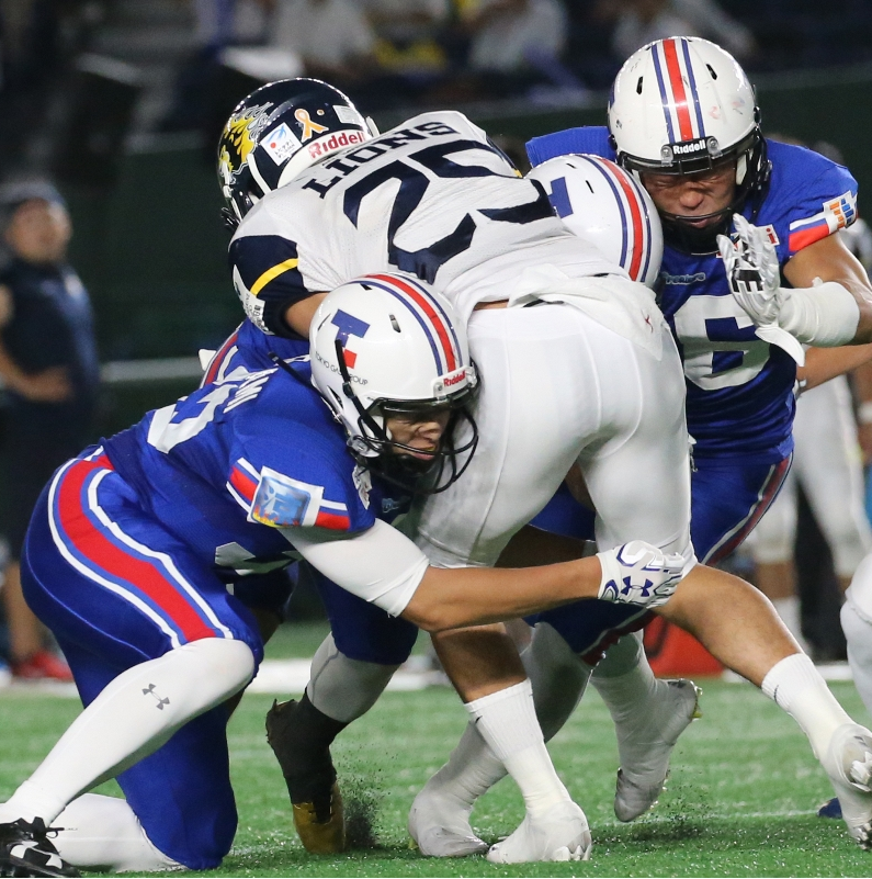 試合は、第1Q、ライオンズに2つのフィールドゴールで6点を先制され、第2Qへ。さらにライオンズの攻撃に、ゴール前まで攻め込まれるが、#41DB古谷が起死回生の