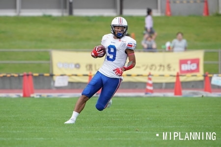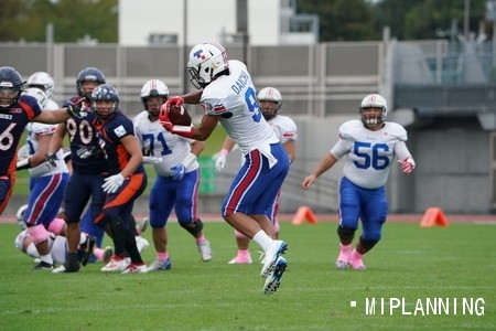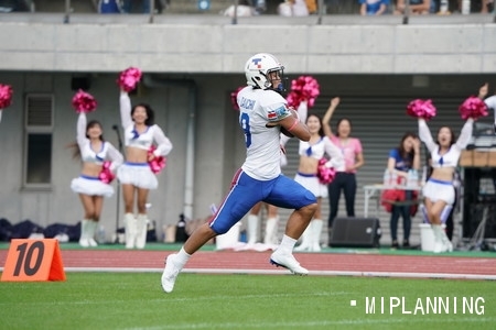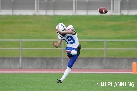 #6 QB イカイカのパスを#9 WR 岩越が相手と競り合いながらキャッチすると