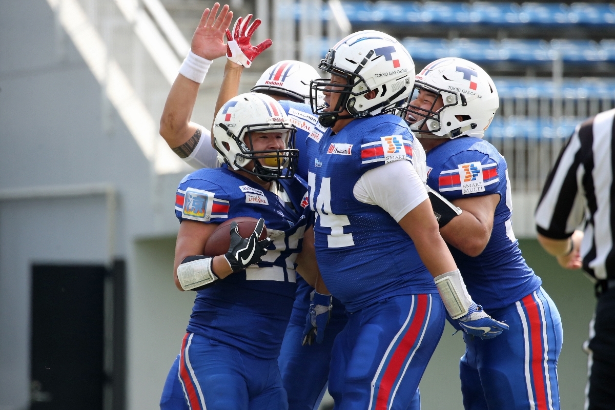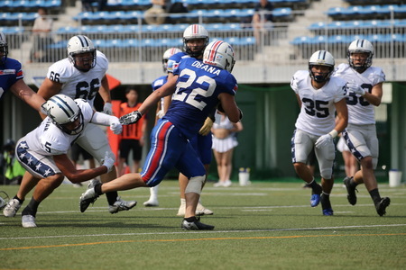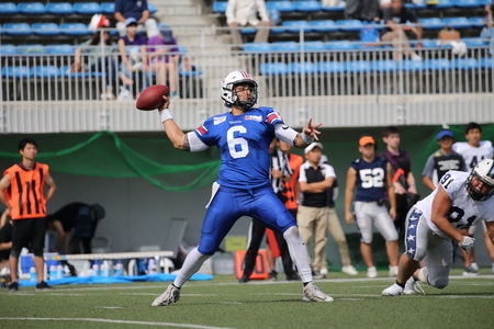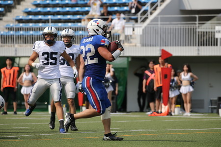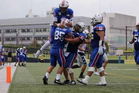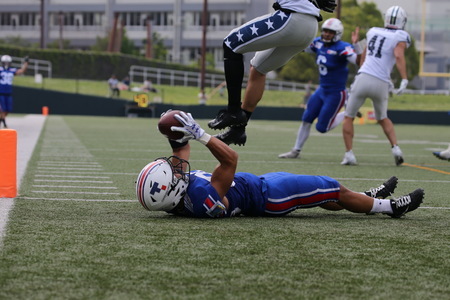 シルバースターリードのままゲームが続いていましたが、残り2分半、クリエイターズの攻撃になります。厳しいシチュエーションの中、#6QBイカイカは、#5WR高岡、#23WR大下に次々とパスを決め、ピンチな状況もナイスプレーで乗り越えダウンを更新します。そして昨年の怪我から復帰した#9WR岩越のパスでゴール前13ydへ。最後は、#6QBイカイカのパスターゲットが見つからずスクランブル。自らゴール隅に飛び込み、タッチダウン!!!!