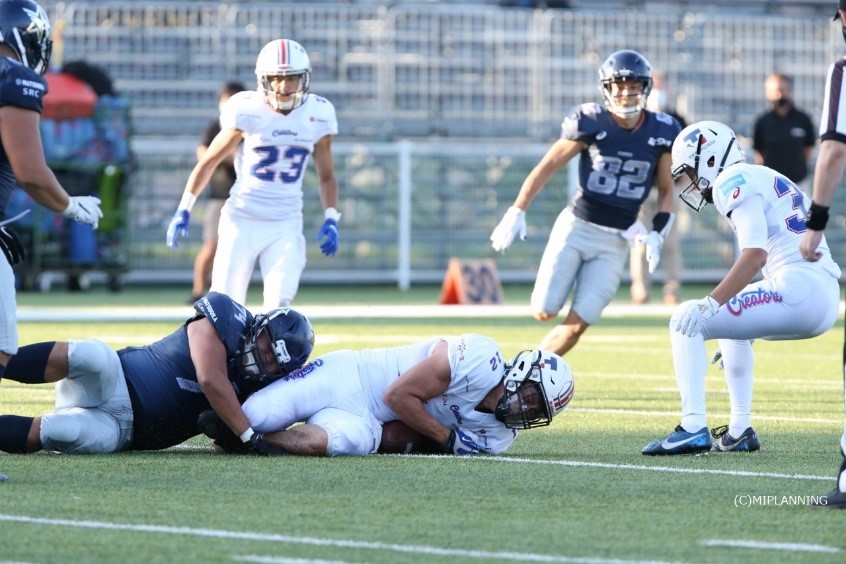 ファイニーズの攻撃でクリエイターズ#91DL吉田が1回タックルをかわされるも諦めずに走り、#19QBコーディーに再度タックル(QBサック)をしてファンブルを誘発。前方にはじき出されたボールをクリエイターズ#12LB安田がリカバーし攻撃権を得る。