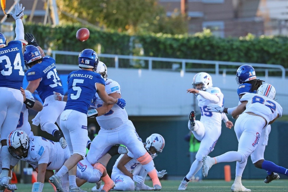 ビッグブルーは#2QB政本から#8WRスミスへ51ydパスを成功させ、さらに#21RB佐藤の11ydランでわずか2プレイでタッチダウンを決める。【23-27】