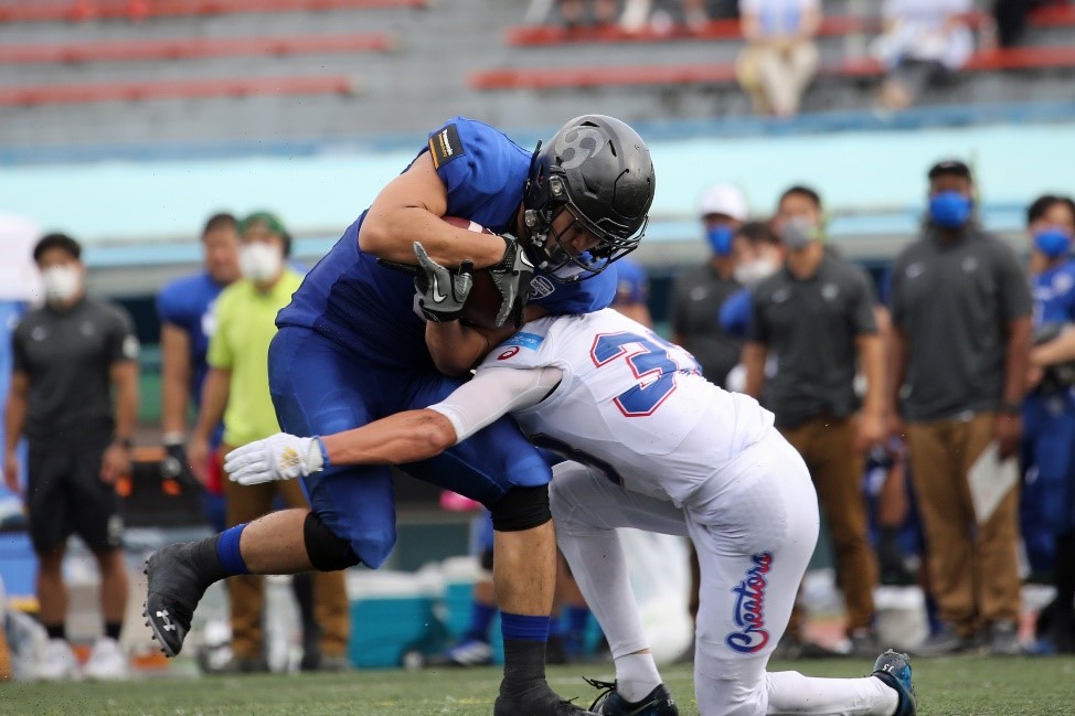 続くクリエイターズの攻撃は2プレイ目でインパルス#49LB青根にパスをインターセプトされ、そのまま30ydリターンタッチダウンを奪われる。【0-37】