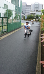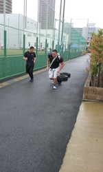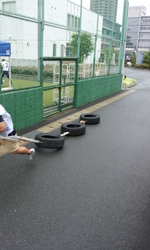グランド内では使用できないので、グランドの脇の通路で行っています。