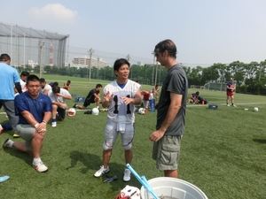 #17古川主将はちょっぴり英語まじりにHCカートとお話中。