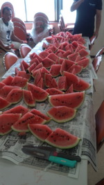 スイカ、昼食後は深川に戻って荷下ろしをする部隊、お借りした部屋やグランドを掃除する部隊にわかれました。