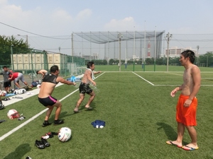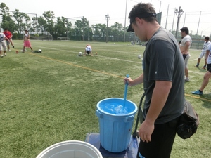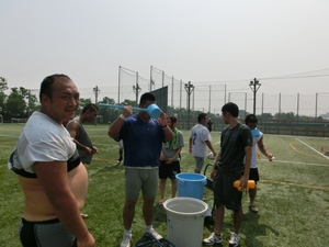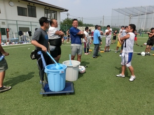 ストレッチ中、TRさんの粋な計らいでフィールドに氷入りバケツが登場。