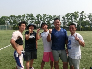 #14QB室田選手、MGR関口、#16DB松本選手、#70DL木村選手、#2RB鈴木選手。