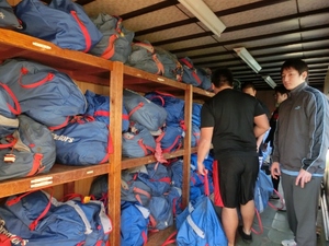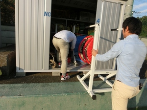 もともとトレーニング器具などで満タンだった倉庫に野本選手が持っている大きなトレーニング器具×2台をなんとか収納!