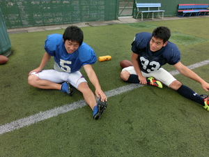 念入りにストレッチを行う飯島選手と新人 宮崎選手です。