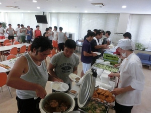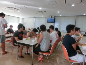 合宿2日目の朝はご飯の時間から試合のビデオが流れていました。