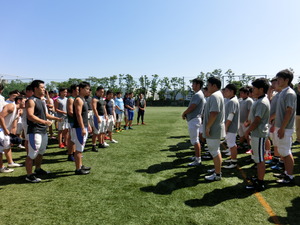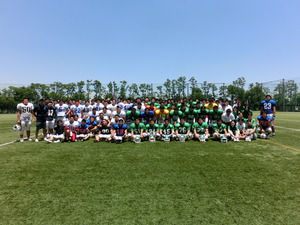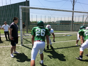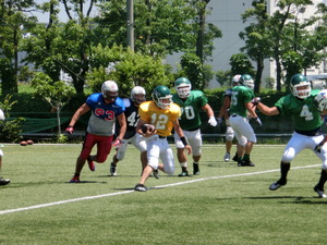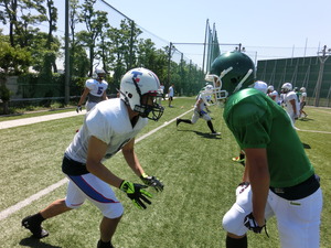 LB#29熊谷選手を筆頭に、DB#41権代選手、WR#85大下選手、新人QBの中本選手、と私MGR落合です。