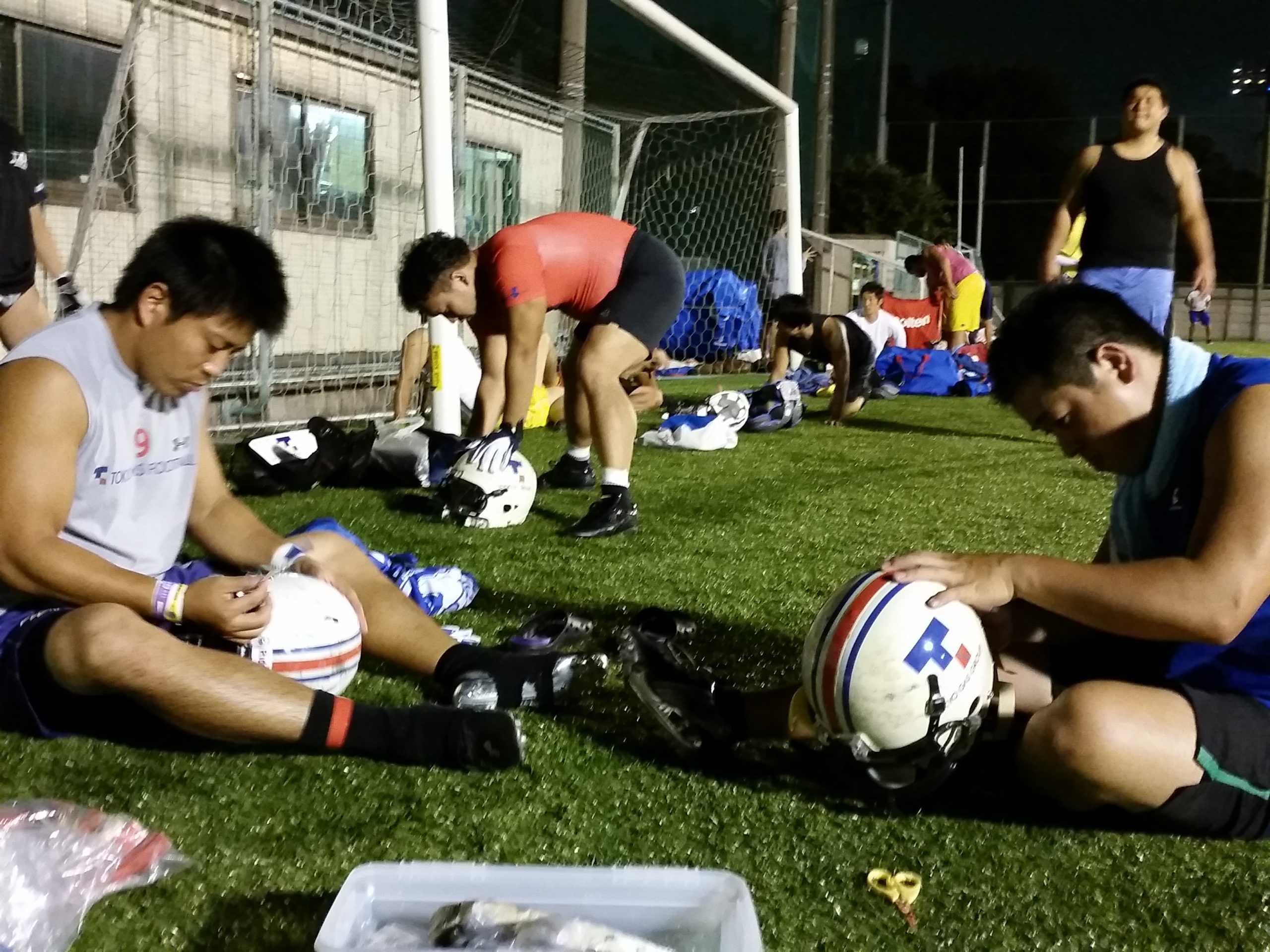 練習前、#52LB河西選手と#22RB尾花選手はヘルメットのシールを貼り直していました。