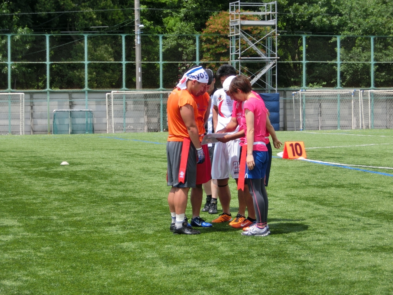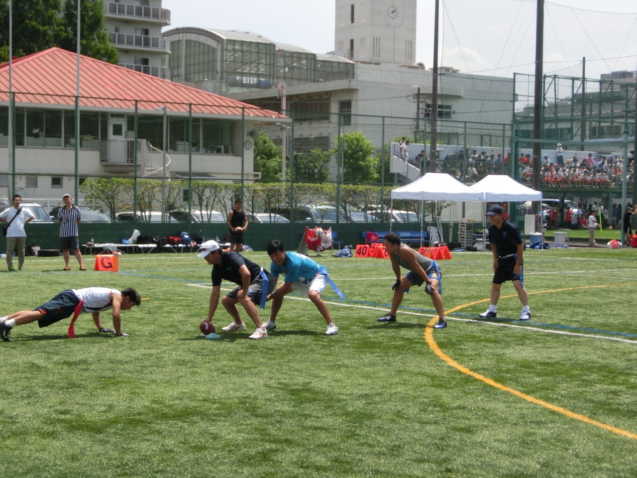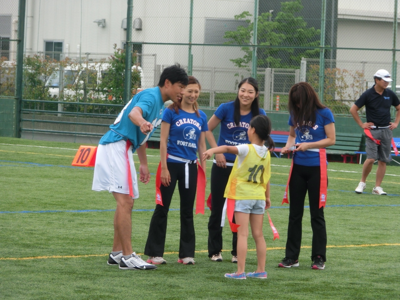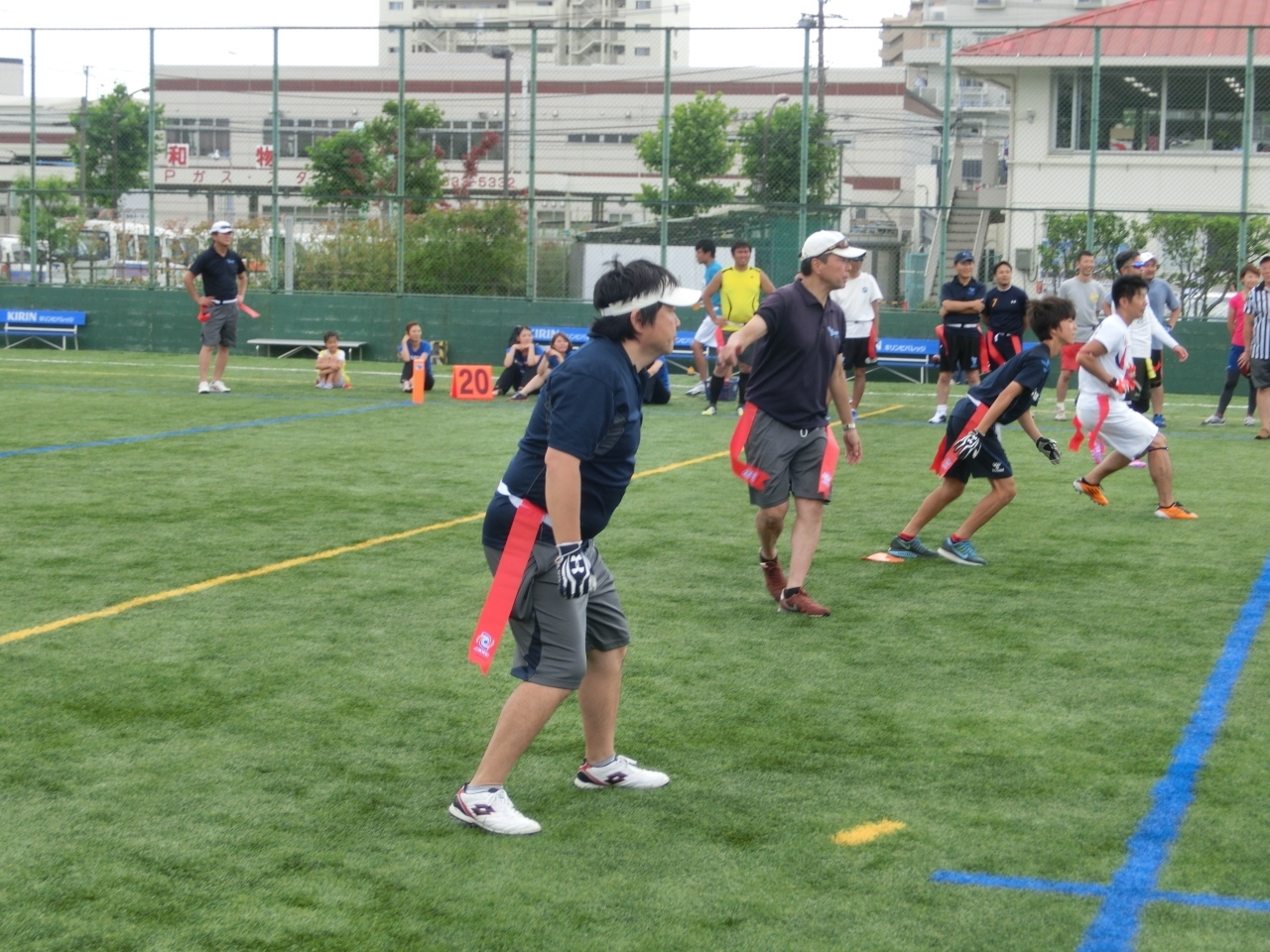 とても良い天気に恵まれ、暑い中でOB、現役選手、チア、スタッフが集まって楽しくフラッグフットボールを行いました。
