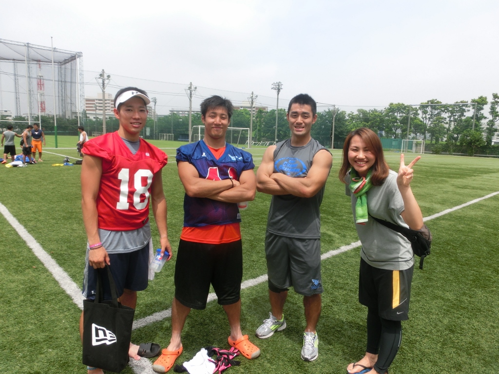 (#18QB中本選手、#41DB権代選手、#29LB熊谷選手、MGR落合)