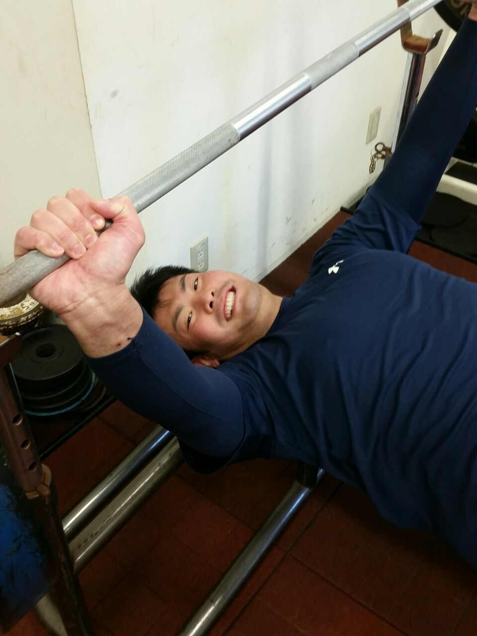 その隣では余裕の表情でベンチプレスをする#71OL由利選手の姿がありました。