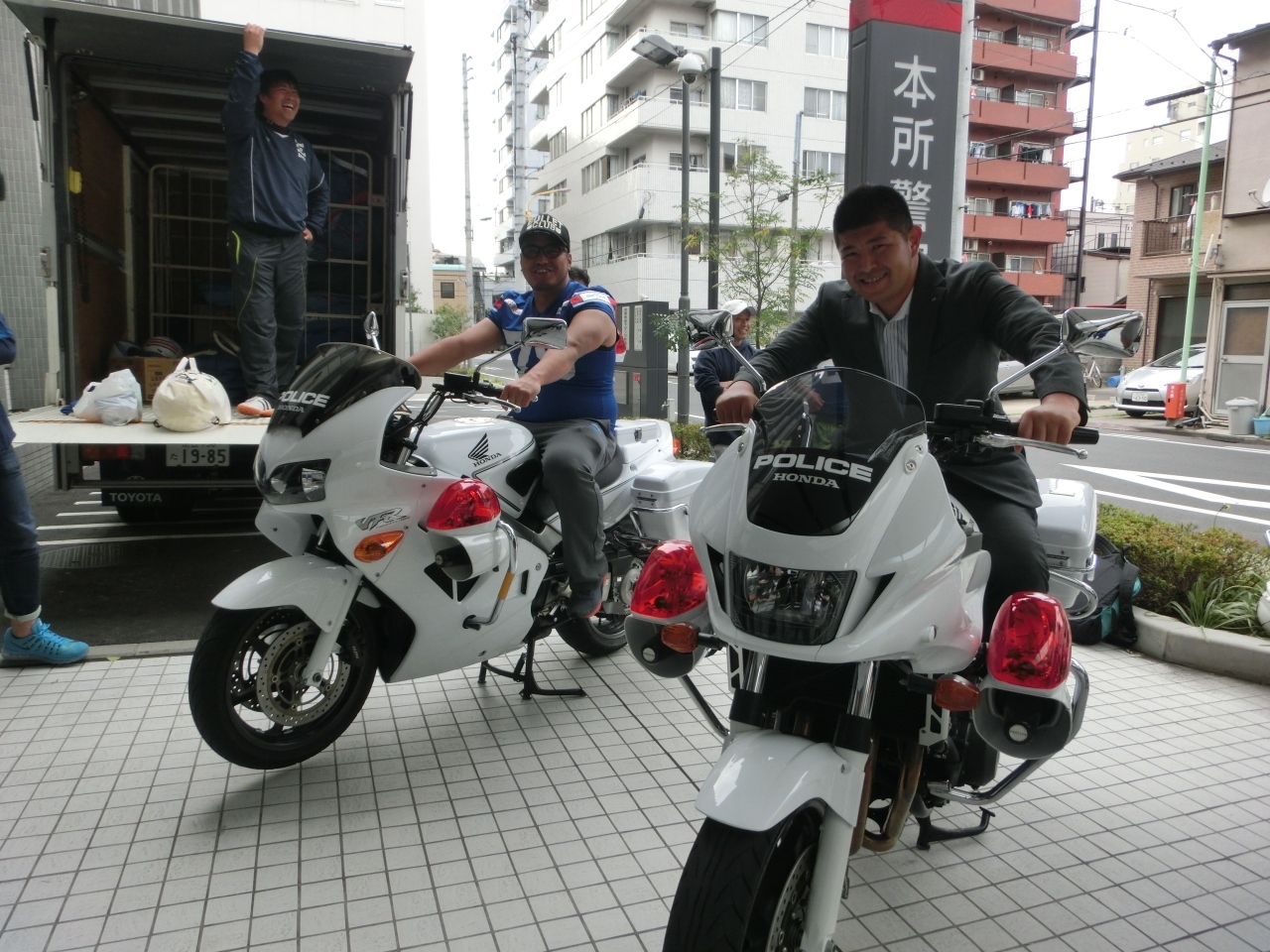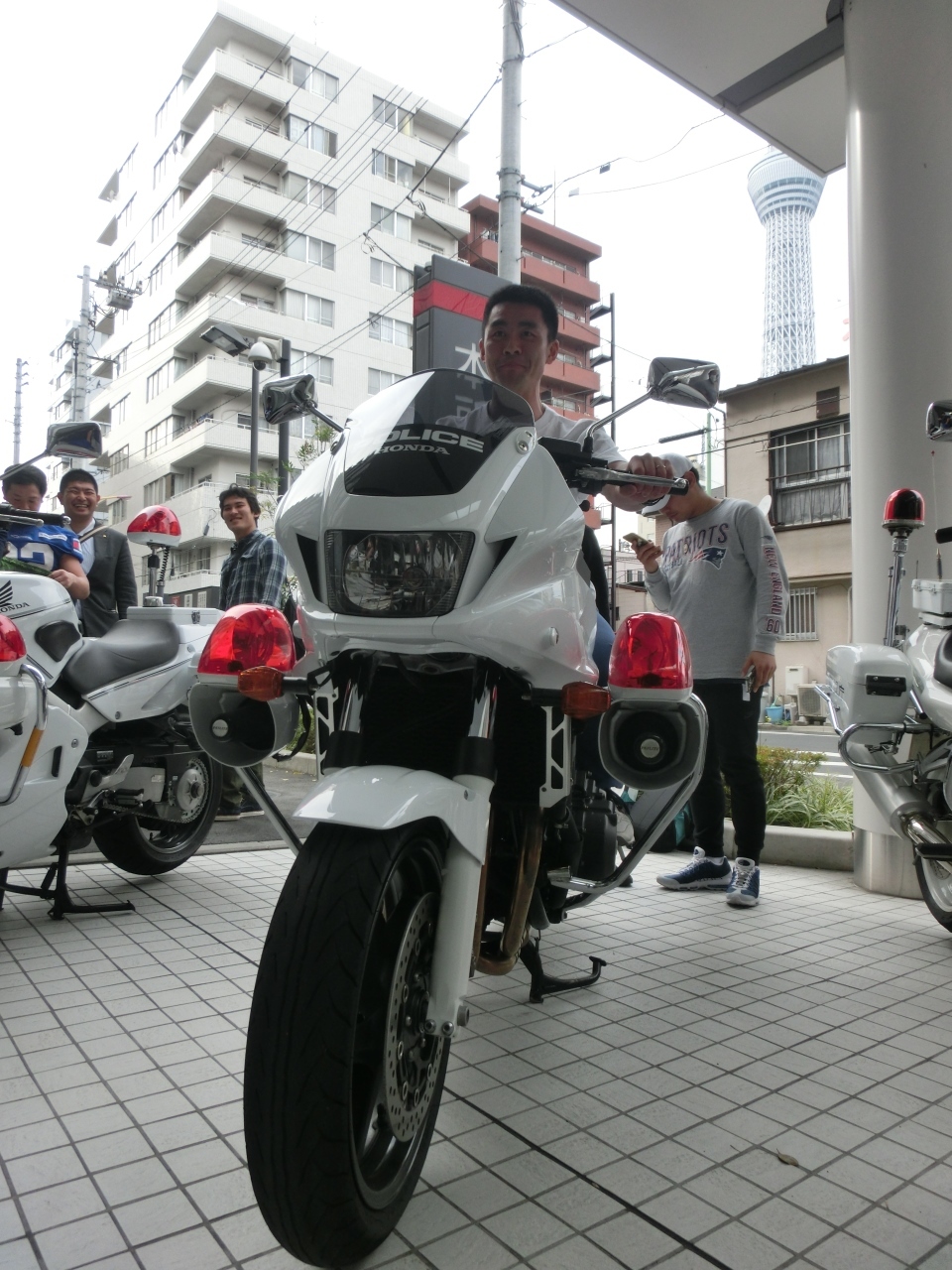 交通安全啓発グッズ配布を終え、本所警察署へ戻ったところ、本所警察署の皆様のご厚意で、白バイとともに記念撮影させていただきました!