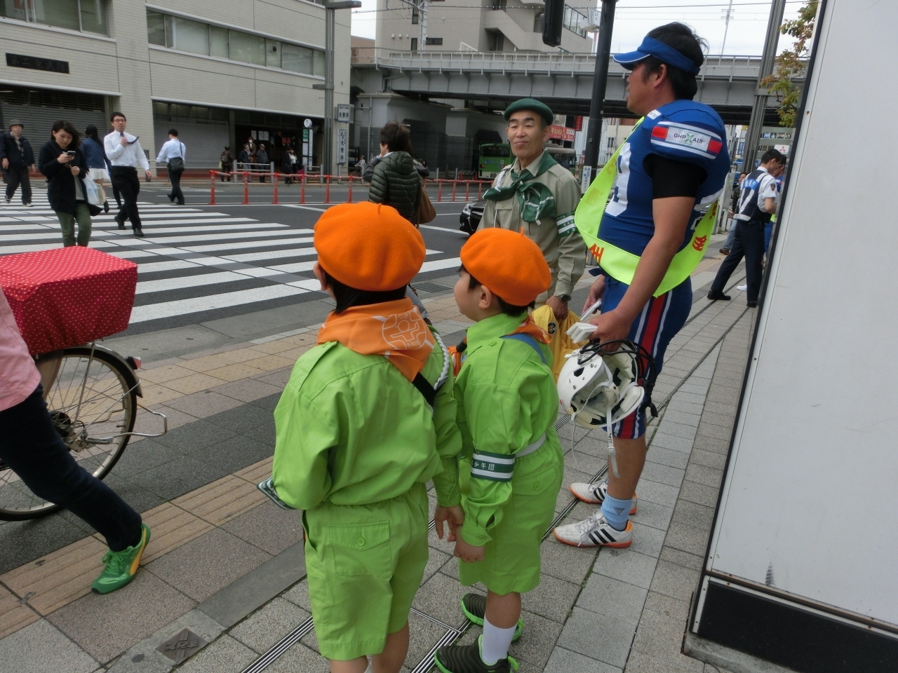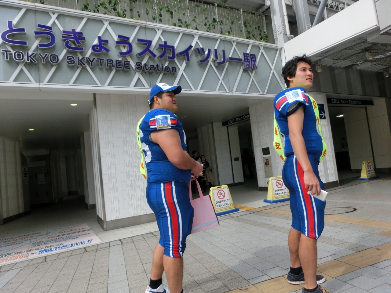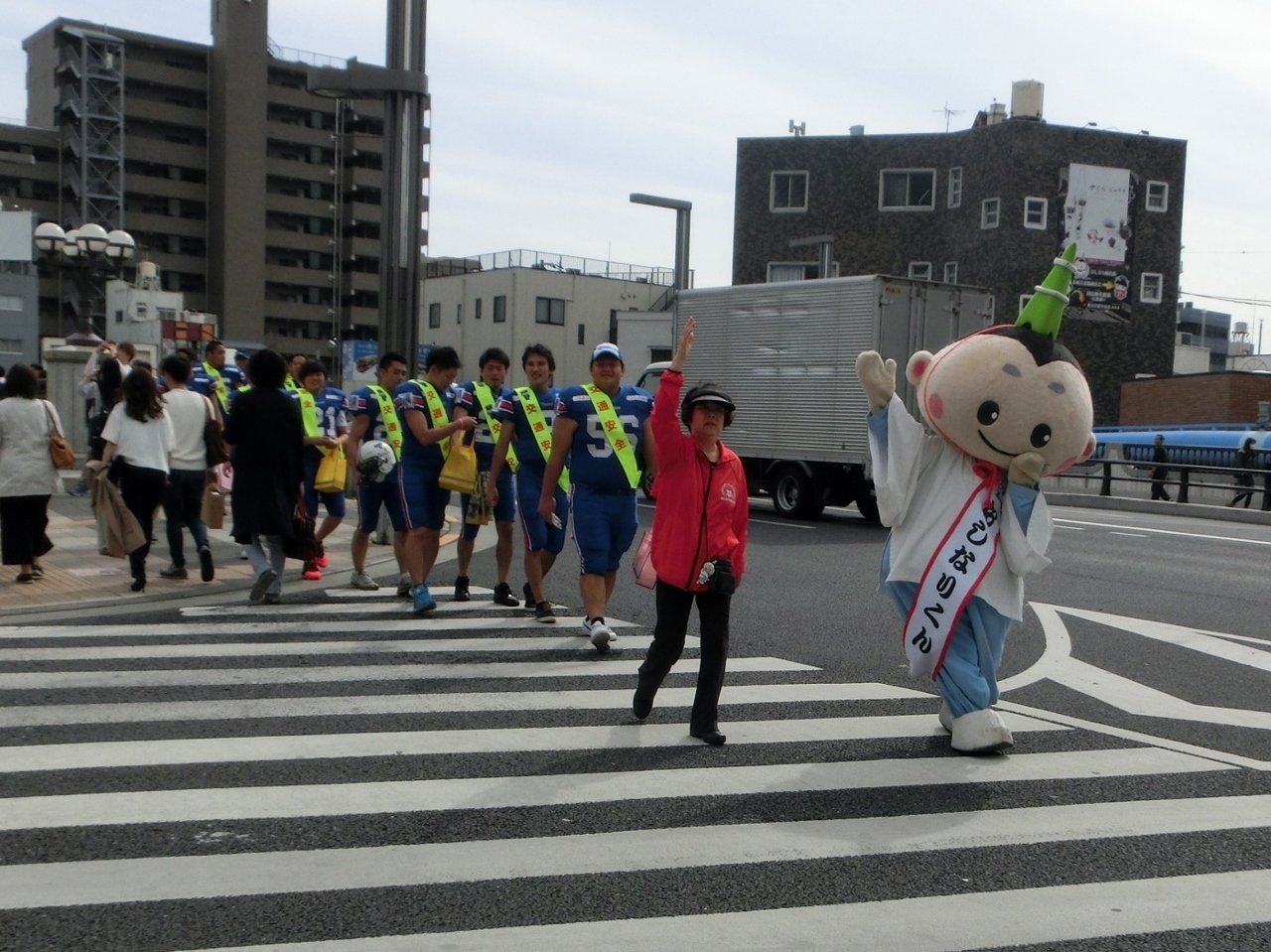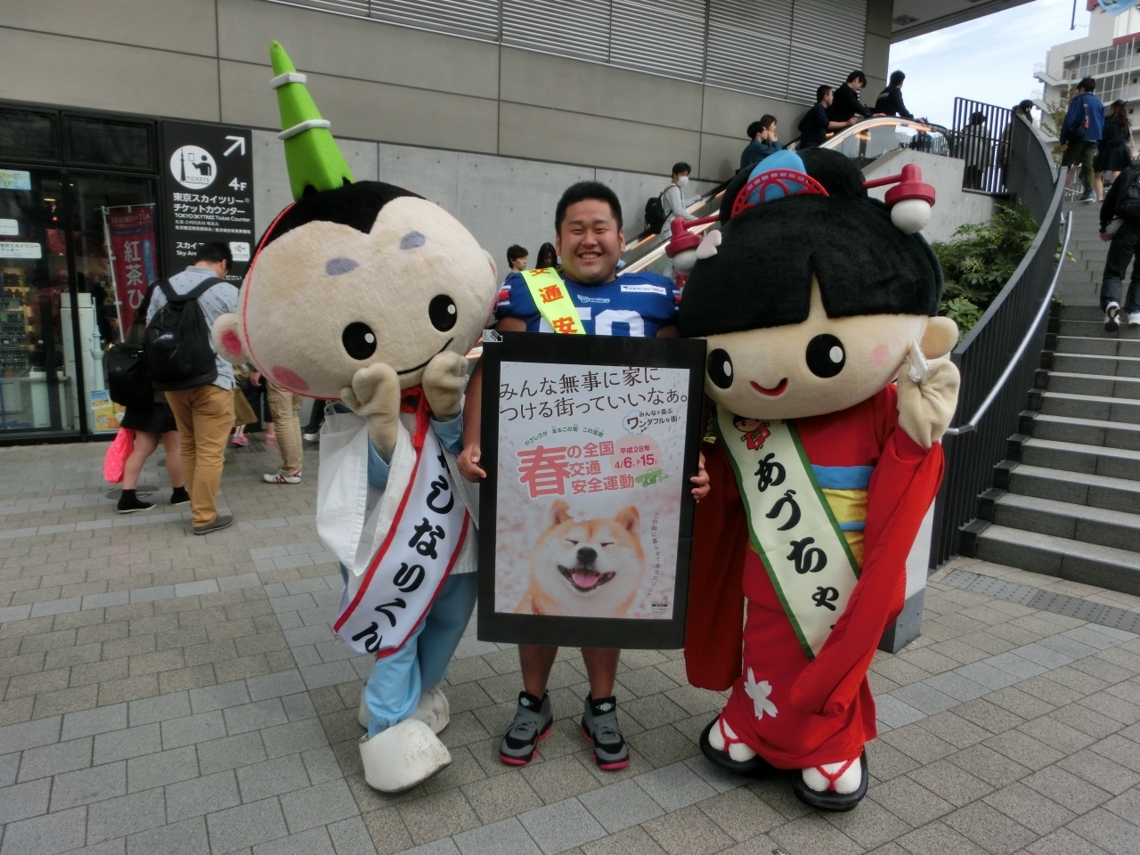 本日はスカイツリー駅前にて墨田区おしなり商店街の「おしなりくん」と吾妻橋地区の「あづちゃん」、そして交通少年団の皆さんと交通安全啓発グッズの配布を行いました。