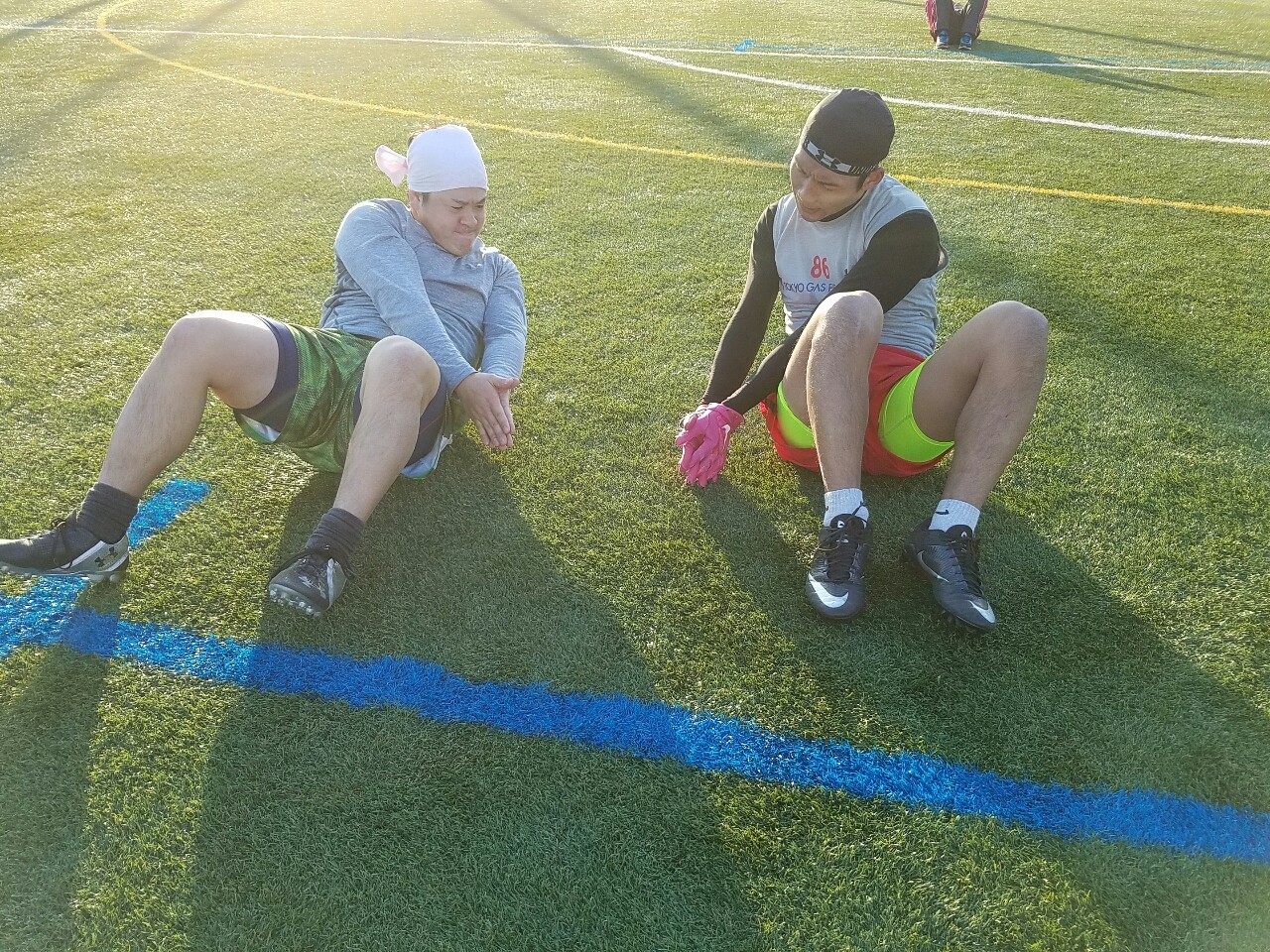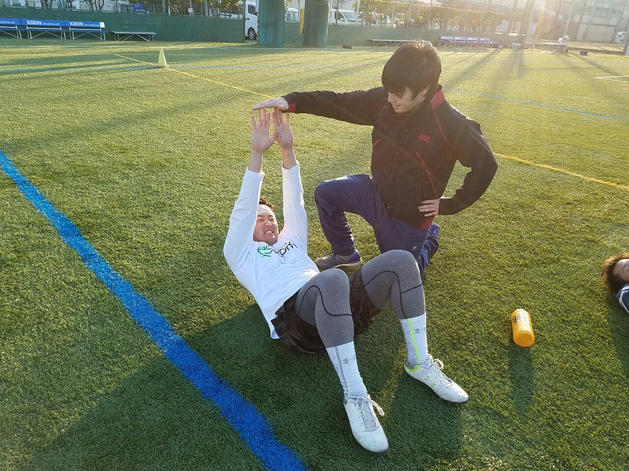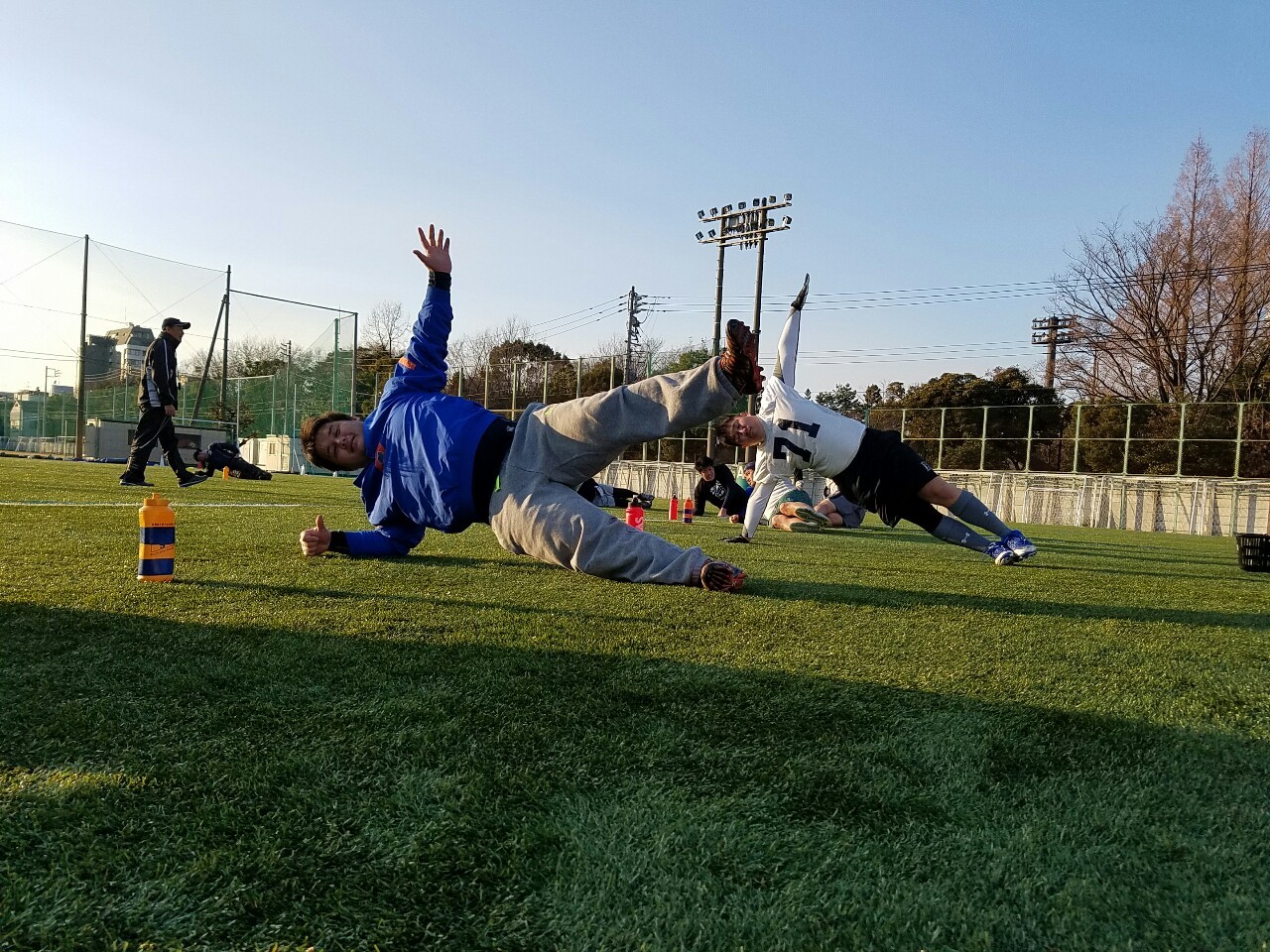 最初は2人1組でおんぶをしながらランジやダッシュ?などなど、ひらすらグランドを往復。
